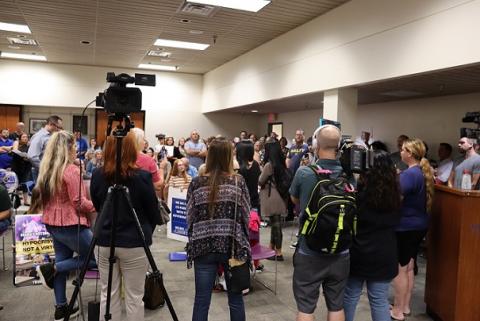 Before the meeting began, chairs in the board room were separated by three feet, which infuriated some audience members, who then started lining the walls. Space was made available in an overflow room to watch the meeting, but no one appeared to leave.