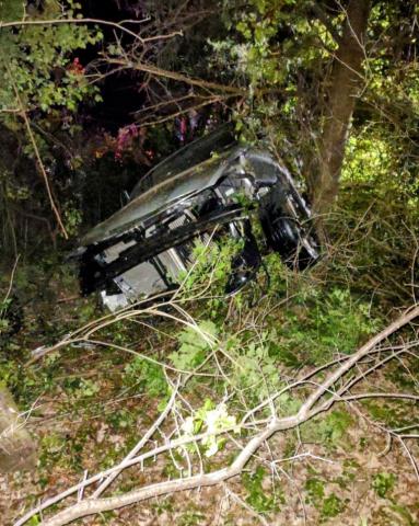 Deputies continued their search efforts and used a thermal-imaging drone to help locate the wreckage, about 50 feet off the paved roadway, south of the "T" intersection, and hidden in thick brush and numerous trees, where it came to rest after launching up over an 8 foot embankment and traveling into the thick foliage, hiding it from visibility.
