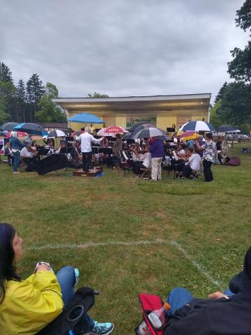 Half of the Symphony was protected under a band shell, while the string section was seated in front of the mobile structure, with players and their expensive instruments protected by volunteers holding umbrellas. Sitting in lawn chairs, several hundred audience members spread out in an expansive area between the band shell and a tree line.