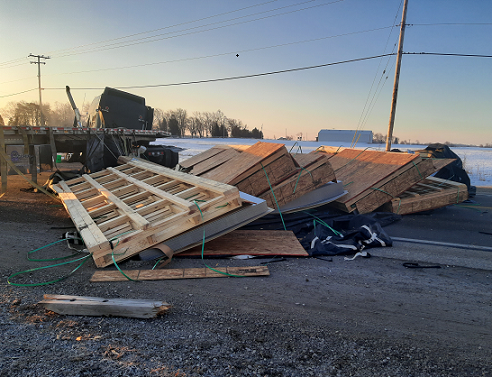According to a news release, the driver missed a stop sign and struck a semi towing a trailer, causing it to lose its load of industrial aluminum sheeting. The Jeep then went on to strike a heavy-duty flatbed truck.