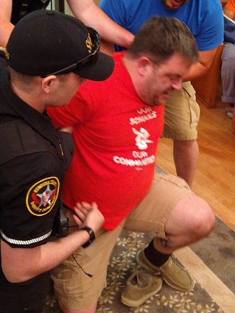 As the two deputies, with help from a couple of audience members, tried to make the arrest, Trudell yelled "I'm trying to talk. What is going on here?"
