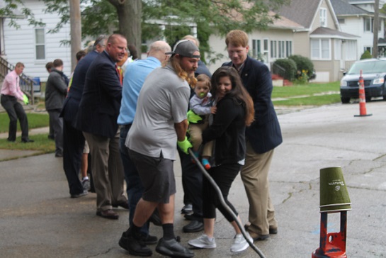 Selena Mercado of 4703 19th Ave. on the city’s near north side hosted a group of state and local officials Tuesday. Gathering under umbrellas and pop-up tents in the street, they marked the occasion with a round of speeches, then grabbed hold of a previously disconnected lead lateral and yanked it out of the ground.