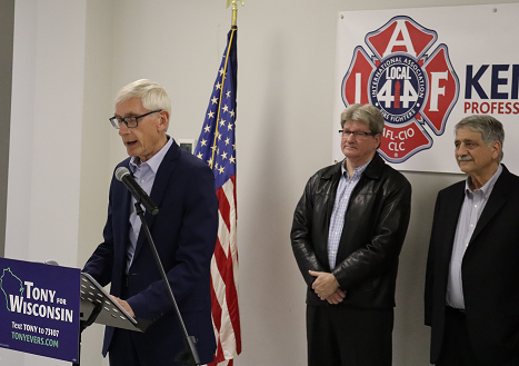 At the Kenosha Union Club, Gov. Evers stood behind Antaramian while he was making his remarks and alongside other Democrats, including members of the Kenosha Professional Firefighters Association which formally endorsed Evers.