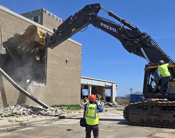 With that, Mason got behind the controls and poked the first hole into a north side wall of the brick building. The action exposed the building’s gym.