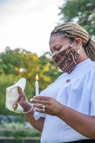 It had a 2020 twist to it, though, with the requirement of face masks, social distancing and holding the event outdoors to provide a safer way to honor the graduates during the current pandemic. Holding it outdoors also allowed the college to put on the traditional candlelight ceremony of the Blessing of the Hands – an event which cannot be held typically because of fire safety concerns for indoor events.