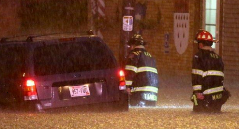 The torrential rain flooded streets, basements and businesses, and stranded at least one motorist in her vehicle. The woman was rescued by firefighters, according to Fire Chief Chuck Leipzig, who said the water depth in one street hit nearly six feet. No injuries were reported.