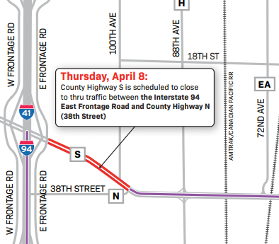 Beginning Thursday, County Highway ‘S’ will be closed to through traffic from the interstate to County Highway ‘N’. That closure is expected to last well into fall as crews work to complete a two-year-long project that includes making the highway four lanes all the way from the interstate to Green Bay Rd.
