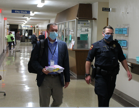City Clerk/Treasurer Matt Krauter--with a police escort--left the Municipal Building at 3:20 this morning to deliver election drives and other material to Kenosha County's tabulation center at Highways 50 and 45.