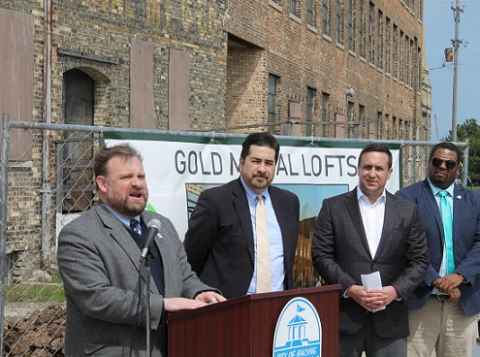 Dignitaries gathered outside of the former Gold Medal Camp Furniture building at 1701 Packard Ave. Monday. They formally marked the start of a $18 million project to turn the 1890’s era building into 77 apartments. Some of the units will be what’s called “affordable” housing while others will rent at market rates.