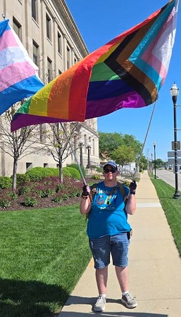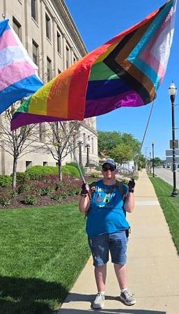 Cal Miller is waving both the Pride and Transgender flags on the sidewalk. It's a runup to an event at 5:30 to mark the 55th anniversary of the Stonewall riots. A New York City police raid at the gay bar 56 years ago led to the modern-day LGBTQ rights movement.
