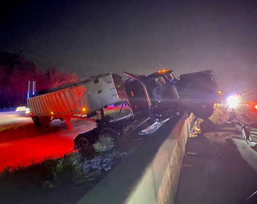 An allegedly impaired semi driver crashed on I-94 in Racine County early Sunday morning, spilling his load of limestone all over the highway but causing no serious injuries. Authorities responded to a report that a reckless semi driver had taken out a road sign. Near County K-R, deputies found a semi perpendicular to the interstate, straddling a wall. The driver was able to climb out of the cab himself. The 27-year-old Greenfield, Wisconsin man was cited for OWI, first offense. Southbound lanes were closed for several hours.