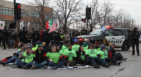 Racine---About two-dozen demonstrators were arrested for blocking traffic at a busy downtown intersection late Monday afternoon. They were part of a group of several hundred protestors who were seeking renewal of the Deferred Action for Childhood Arrivals program. The demonstration began earlier Monday when dozens of students walked out of Horlick High School and marched to Monument Square. Those arrested included the two Democrats who are seeking their party's nomination in the 1st Congressional District. Other demonstrators were from Milwaukee and Madison. Those arrested were hauled off in police transport vans, ticketed then released.