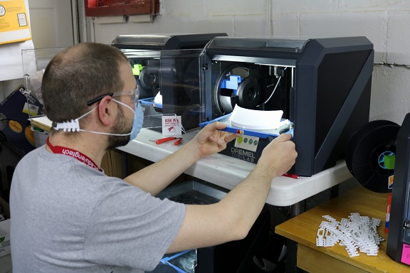 (WGTD)--Staffers at Gateway Technical College's Fab Lab at the iMET Center in Sturtevant have joined the ranks of others who are producing personal protective equipment for health care workers and emergency responders. John Zehren and Adam Reed are using 3D printers to manufacture what they call a "mask tension relief band." It's a plastic piece worn behind the head to keep masks in place. They take the place of elastic bands that loop around the ears. Those bands can become uncomfortable over time. The Fab Lab techs are also in the process of developing plastic shields.