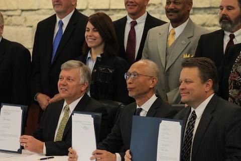 In his comments at the signing ceremony, Dr. Louis Woo, the top-ranking company official present, seemed to want to quell any signs of buyer's remorse among the elected officials. "I know that some of you thought you were going out on a political limb... to agreeing to this agreement together with Foxconn," he said. "I understand that. To any one of us an uncertain future is kind of scary. But I can assure you we've done this before."