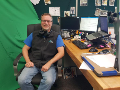 The technologicaly-savvy Overrocker explained that he modified his classroom to include a green screen, a document stand and multiple cameras and monitors, all run by video production software.