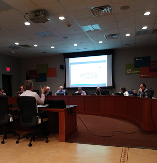 Meeting in work session mode, the board discussed the wording for a policy resolution that would commit the district to a level of borrowing that would result in a stable tax rate for debt service purposes.