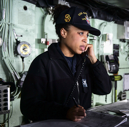 Quartermaster 2nd Class Jacqueline Goods is photographed on the bridge of the USS San Diego, an amphibious transport dock ship, as it plies through the South China Sea. In her role as a Quartermaster of the Watch, Jacqueline is responsible for providing navigational data and recommendations to the Officer of the Deck. She stands this watch for 3 hours, twice a day, in addition to her normal work day duties as Assistant Lead Petty Officer in charge of 7 junior quartermasters.
