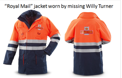 Although no photo was immediately available, Willy Turner may have been wearing at the time of his disappearance an orange/blue jacket with the words "Royal Mail" inscribed on the front and back, along with gray sweatpants and black shoes.