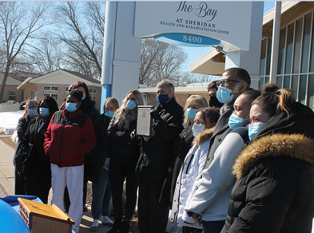The staff and administration at The Bay of Sheridan Health and Rehabilitation Center on south Sheridan Rd. in Kenosha celebrated the milestone last week as they were presented with a legislative commendation from two local state representatives, Tod Ohnstad and Tip McGuire.