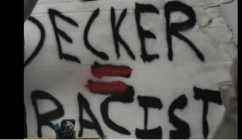 Decker said afterward she sat the way she did because she didn’t want to look at posters taped to the wall of the meeting room accusing her and other supervisors of being racist. She called the posters hate-filled lies.
