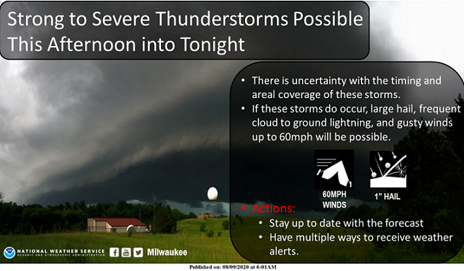 If storms can develop, a few strong to severe storms are possible, mainly along and south of a Mineral Point, to Madison, to Milwaukee line. Large hail to one inch in diameter, damaging winds to 60 MPH, and frequent cloud to ground lightning are possible.