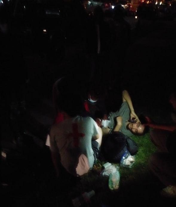At least one protester was injured by the rubber bullets. His colleagues patched him up on the lawn of the Dinosaur Discovery Museum.