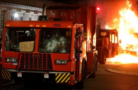 First, several Public Works Dept. trucks that were used to block streets to the Public Safety Building were set ablaze. Firefighters did not respond.
