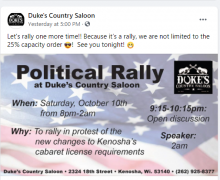 (WGTD/WPR)---A Kenosha tavern appears to be trying to skirt Gov. Evers’ capacity limits on indoor gatherings by holding ‘political rallies’ to ostensibly protest proposed changes in the city’s cabaret license.